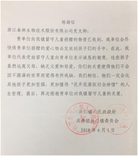 7月初,黨支部收到了興仁鎮兒童寄來的感謝信,信中表達了對泰林生物黨支部為他們帶去關懷與祝福的誠摯感謝。